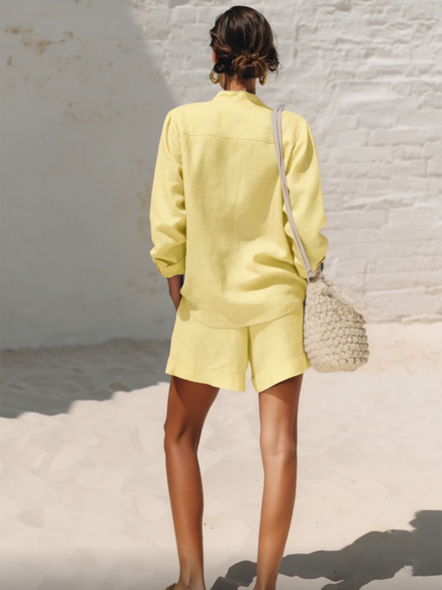This Casual Blue Cotton And Linen V-neck Top And Wide Leg Shorts Set perfectly balances comfort and style. Crafted from a blend of breathable cotton and linen. the set is designed to keep you at ease while looking effortlessly chic. The top features a relaxed V-neck cut that adds a touch of sophistication. while the wide leg shorts offer a carefree. breezy feel. perfect for warm weather.