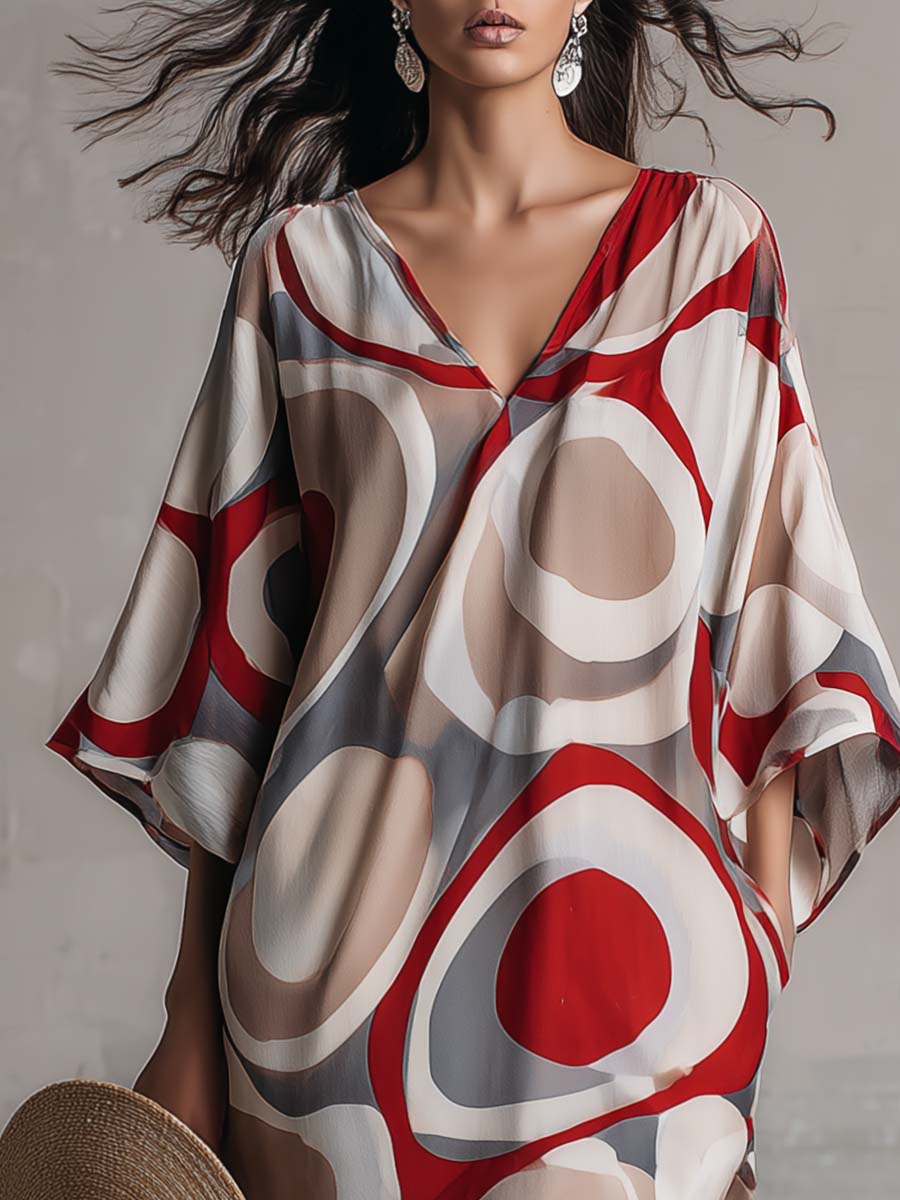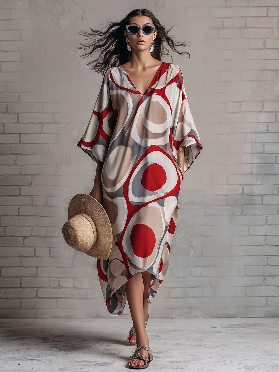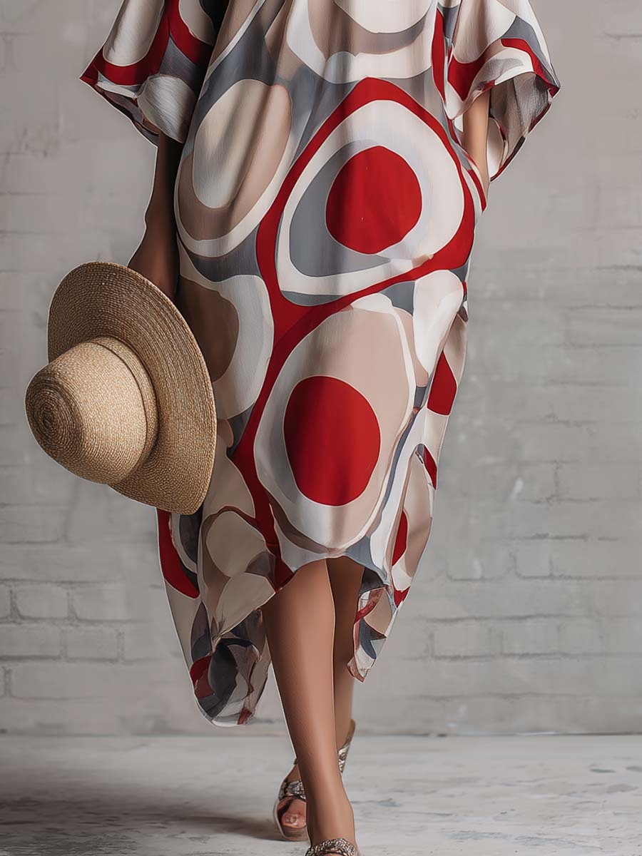 This retro-inspired midi dress combines a soft satin finish with a playful circular print for a timeless yet modern look. The flattering V-neck frames the neckline. while the flowing midi-length skirt creates elegant movement. Lightweight and easy to wear. this dress balances polished shine with relaxed everyday comfort.