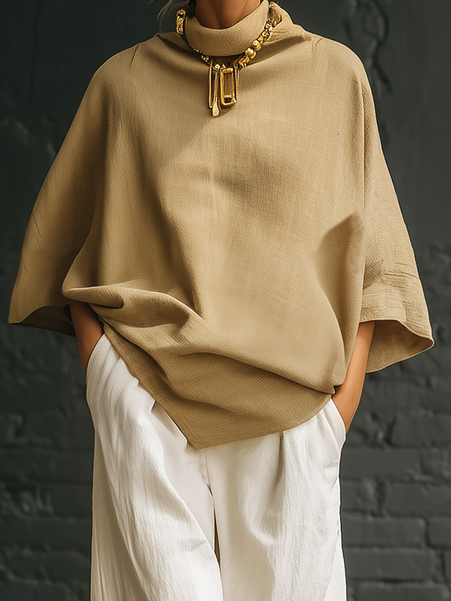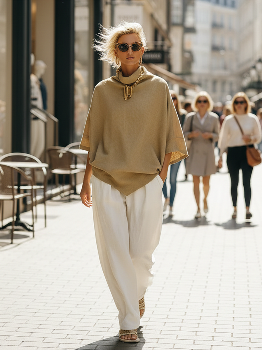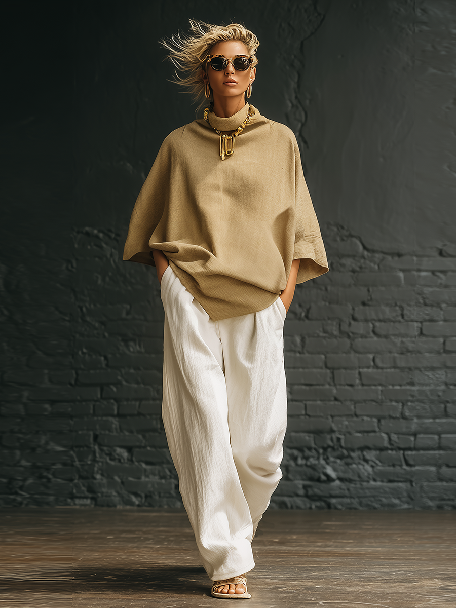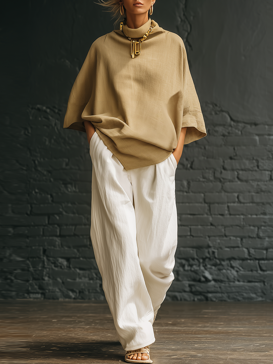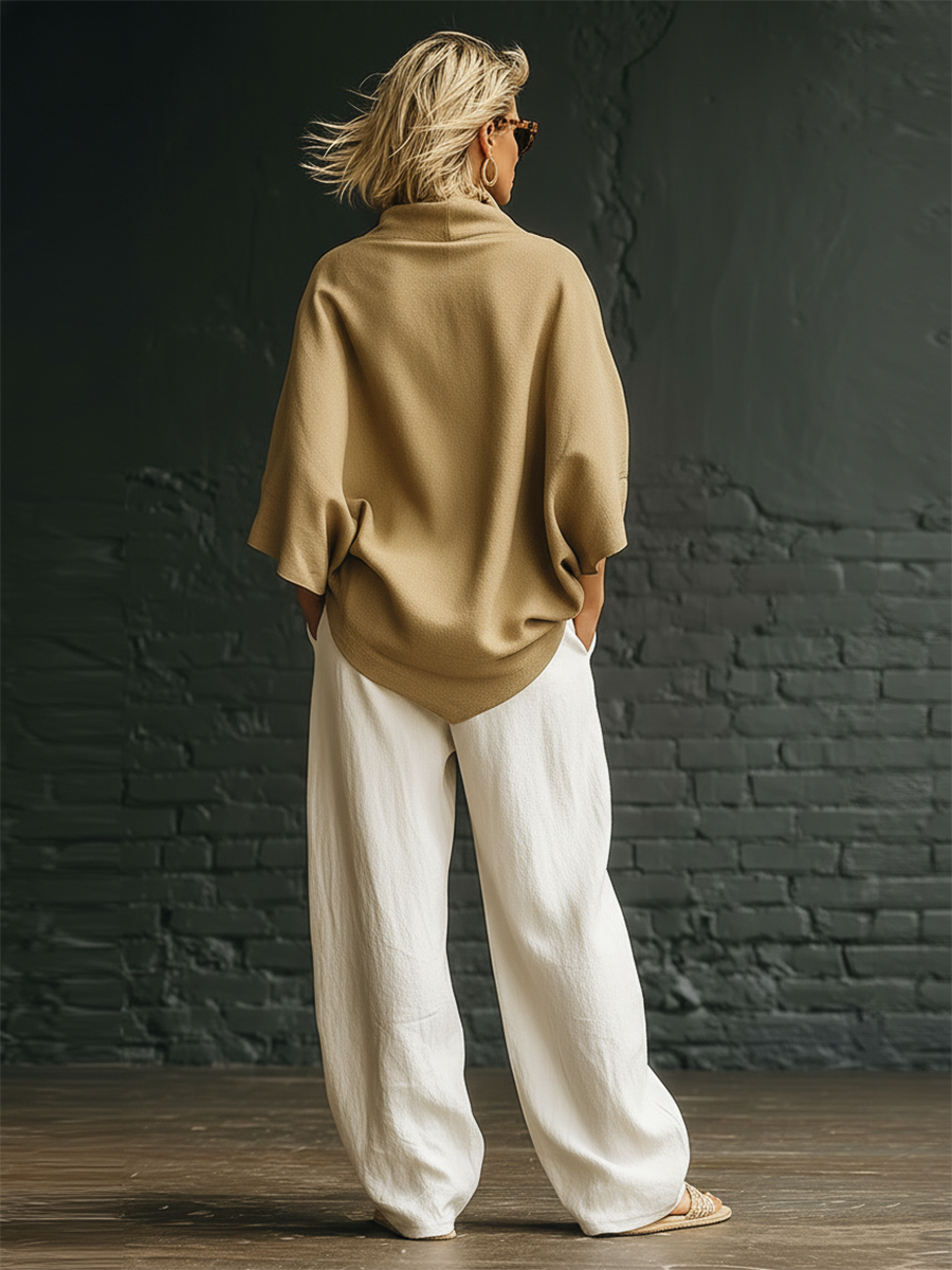 This khaki turtleneck and white wide‑leg pants set is a versatile. modern essential that combines comfort with subtle design details. The cotton‑linen blend keeps the look relaxed and breathable. while the irregular hem adds character to an otherwise minimalist silhouette. Ideal for everyday wear. travel. and smart‑casual occasions—an easy. stylish set to build multiple outfits around.