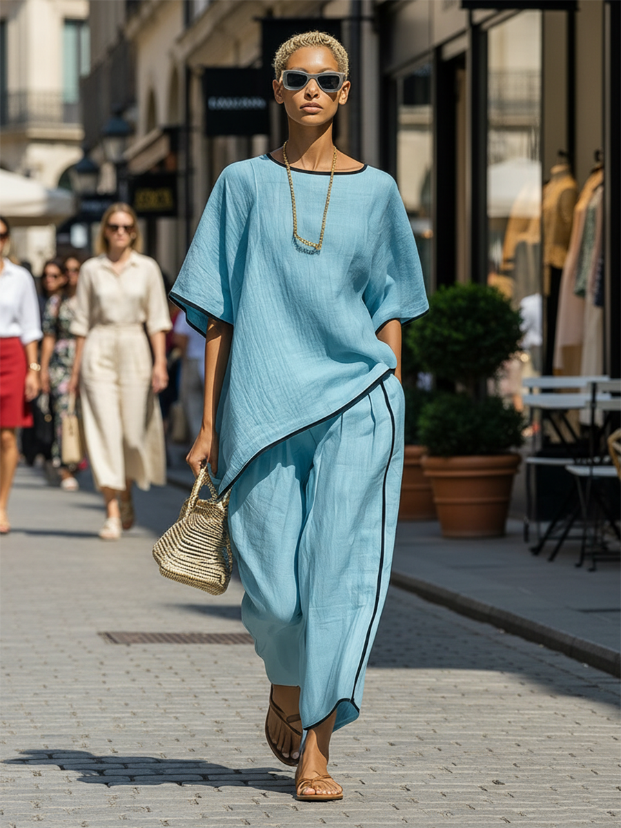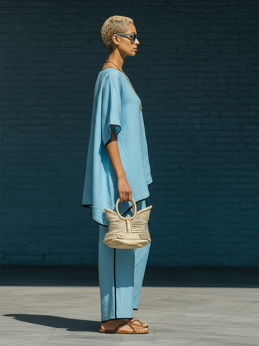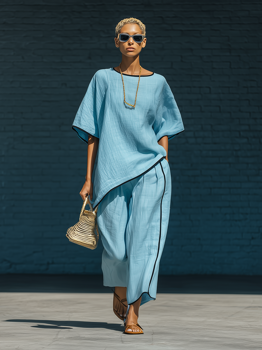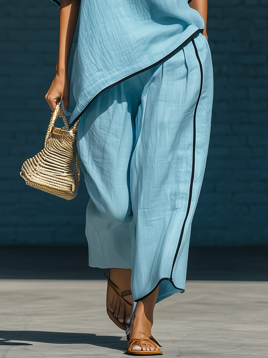 This blue cotton set is a versatile wardrobe staple that merges comfort and modern design. The loose short-sleeved top with an irregular trim and matching wide-leg pants offer effortless styling options and flattering proportions. Ideal for everyday wear. travel. or relaxed occasions when you want a polished yet comfortable outfit.