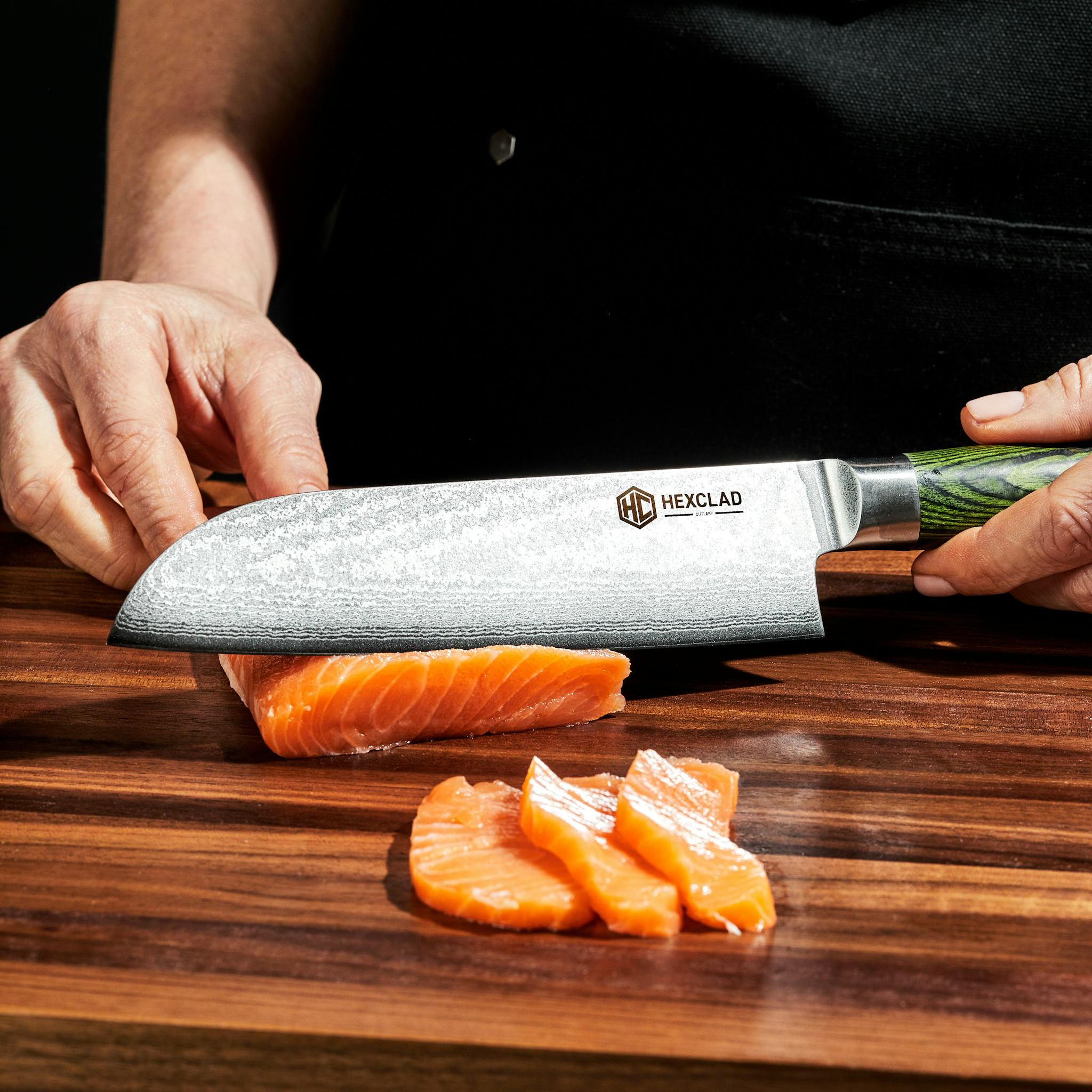 For those who prefer an elegant. timeless design. meet our bestselling. green pakkawood–handled. Japanese Damascus steel HexClad knives. Their look is the definition of style–as striking in a modern kitchen as a rustic one–and we cut no corners in making them. Think: 67 layers of Damascus steel. Twelve degree blade sharpness. Rockwell ratings of 60 or higher. The knives themselves boast ergonomically designed handles of green pakkawood. which is rather rare. We also treated the handles with anti-shrinking technology. for added durability. The magnetic walnut block will help protect blades and keep them sharp while conserving precious counter space. This essential knife set will speed your prep work and level up your cooking prowess.