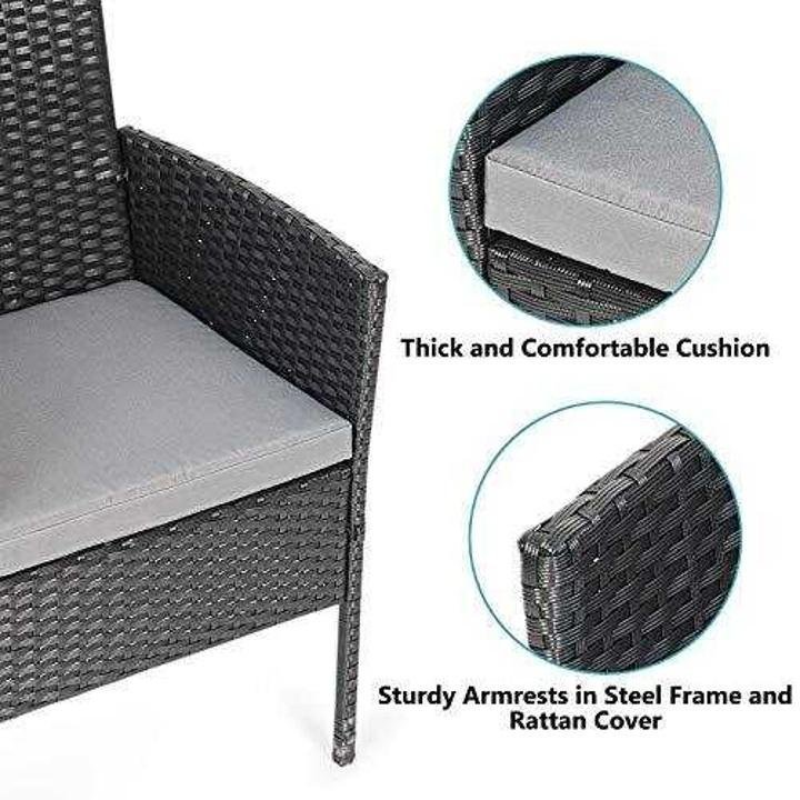 DescriptionBrand: Green4everColor: Black-1Features:▽Durable Construction▼ The table is constructed from strong galvanized steel frame. and tempered table top. There also a 1.57-inch hole allows to add the umbrella for shade. 4 chairs are made of heavy-duty steel frame and wicker.▽Upgrade Comfy▼Lofty sponge padded cushions of 4 chairs provide luxurious lounging experience and more relaxation. The cushions can be attached to the base with clasps to prevent them from sliding. The ottoman can be used to expend seat as well.▽Multiple Functions▼Rattan dining set is suitable for outdoor/indoor terrace. lawn. yard. backyard. porch. garden. poolside and balcony. 31.5§*31.5§ table top provide enough space for placing decorations. drinks. sneaks etc.▽Stylish and Low-maintain▼It can last a long time in a low-maintenance way. PE wicker and glass top could be cleaned with a soft cloth to wipe the dust. Cushion covers with quick zipper are removable for cleaning.▽Easy to put together▼It comes in 2 boxes. It takes 40-60 minutes estimated assembly time to put the dining table together. It is a great Christmas for your family and friend.