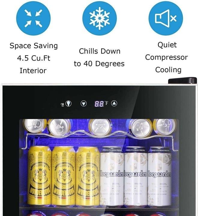 DescriptionBIG STORAGE-4.5 Cu. Ft. capacity holds up to 120 12-oz. cans in this beverage refrigerator. Mini size fit. for everywhere. especially. perfect for your playroom. small kitchen and office.TOUCH PANEL DIGITAL TEMPERATURWE-Large digital display for quick monitoring and setting of any temperature. Equipped with automatic lock function. Working temperature range is 40~F- 61~F. This temperature ensuring your beverages are perfectly frosty.DOUBLE GLASS DOOR-Steel shell cabinet with stainless steel trimmed glass door. Double-pane tempered glass door and air tight seal ensures maximum insulation.Clear double paned glass door make it easy to see what drinks are being chilled.ESSECTIVE BEVERAGE COOLER-This beverage refrigerator runs on a powerful but quiet compressor. Soft LED light making it easier to find a drink.The shelf is removable and can control the interior space.WARRANTE POLICY -Free replacement or parts guarantee for any quality problem within 90 days. Satisfaction guaranteed.