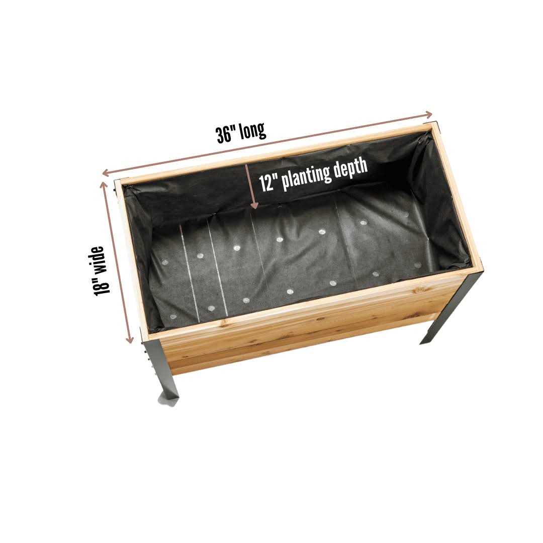 Cedar Planters18″ x 36″ Raised Garden BedFood safe. chemical-free.. and eco-friendlyFree protective linerBuilt-in drainageRot-resistant western red cedarComfortable gardening height18″ wide x 48″ long x 30″ tall (see pictures for your reference)12″ planting depthFood safe. chemical free. and eco-friendlyFree protective linerBuilt-in drainageRot-resistant western red cedarComfortable gardening height18″ wide x 36″ long x 30″ tall (see pictures for your reference)12″ planting depthFood safe. chemical free. and eco-friendly Free protective liner Built-in drainage Rot-resistant western red cedar Comfortable gardening height 18″ wide x 36″ long x 30″ tall (see pictures for your reference) 12″ planting depth.