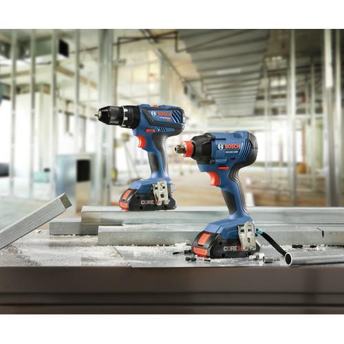 The Bosch 2-Tool Combo Kit with (2) CORE18V next-gen Li-ion 21700 cell technology features 2 tools designed to deliver professional cordless drilling and driving performance. The GXL18V-239B25 kit features (2) CORE18V batteries that provide next-gen Li-ion 21700 cell technology in lightweight. high-power batteries with all-day performance. It includes a GDX18V-1600 Freak Bit/Socket Impact Driver that has a 2-in-1 chuck that offers a 1/4 in. quick-change hex shank with power groove for bits. and a 1/2 in. square drive for sockets. Its motor produces up to 1.600 in.-lbs. of torque and up to 0-3.600 impacts per minute. The HDS181A Compact Tough 1/2 in. Hammer Drill/Driver has an upgraded metal chuck. and its motor delivers the same power as conventional 18V motors in a more compact size. It produces 600 in.-lbs. of torque. up to 27.000 bpm in hammer mode and two drilling speeds (0-1.900 RPM for high speed and 0-500 RPM for high power). The kit includes an 18V charger to get the user back to work fast. and it has two longer belt clips that provide a more secure hold. Features: