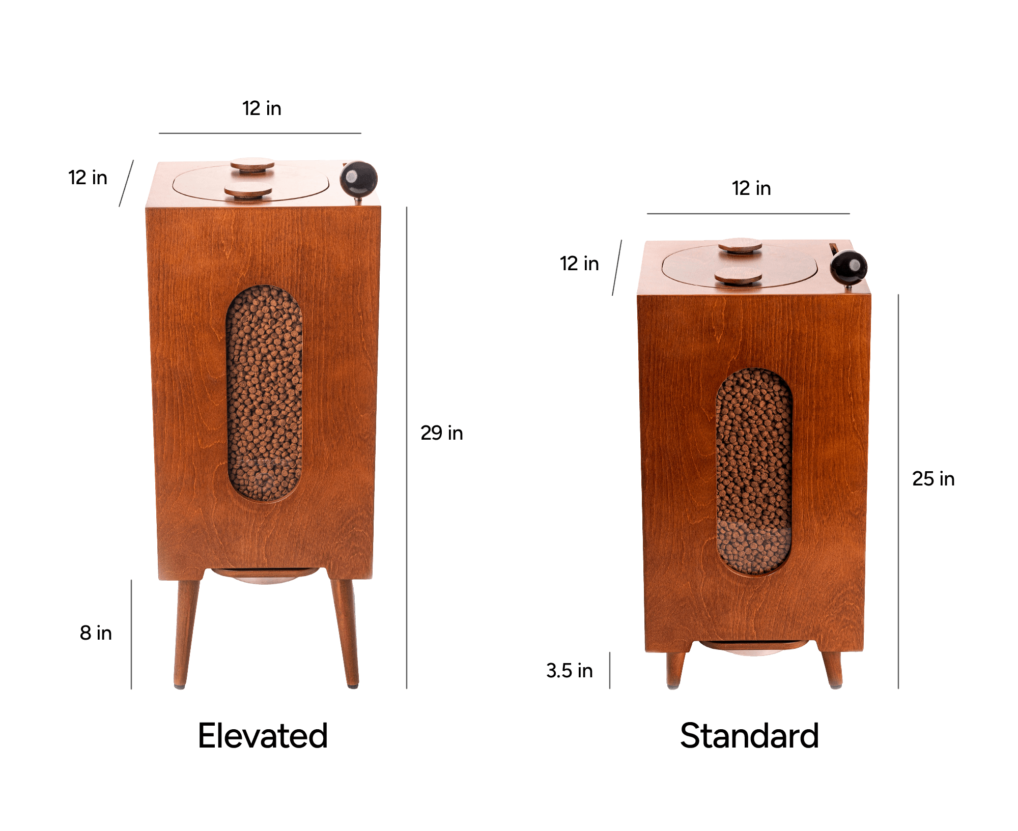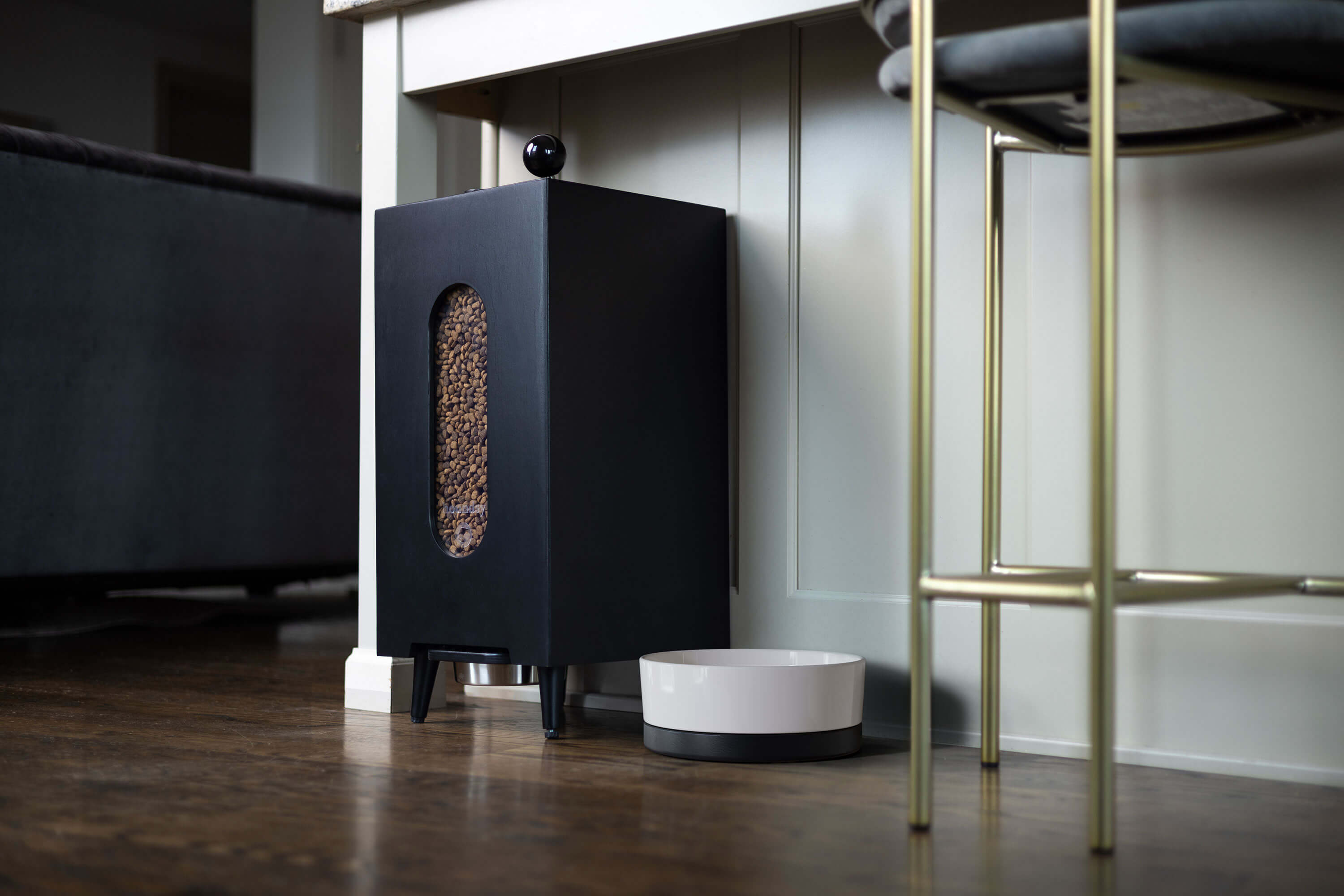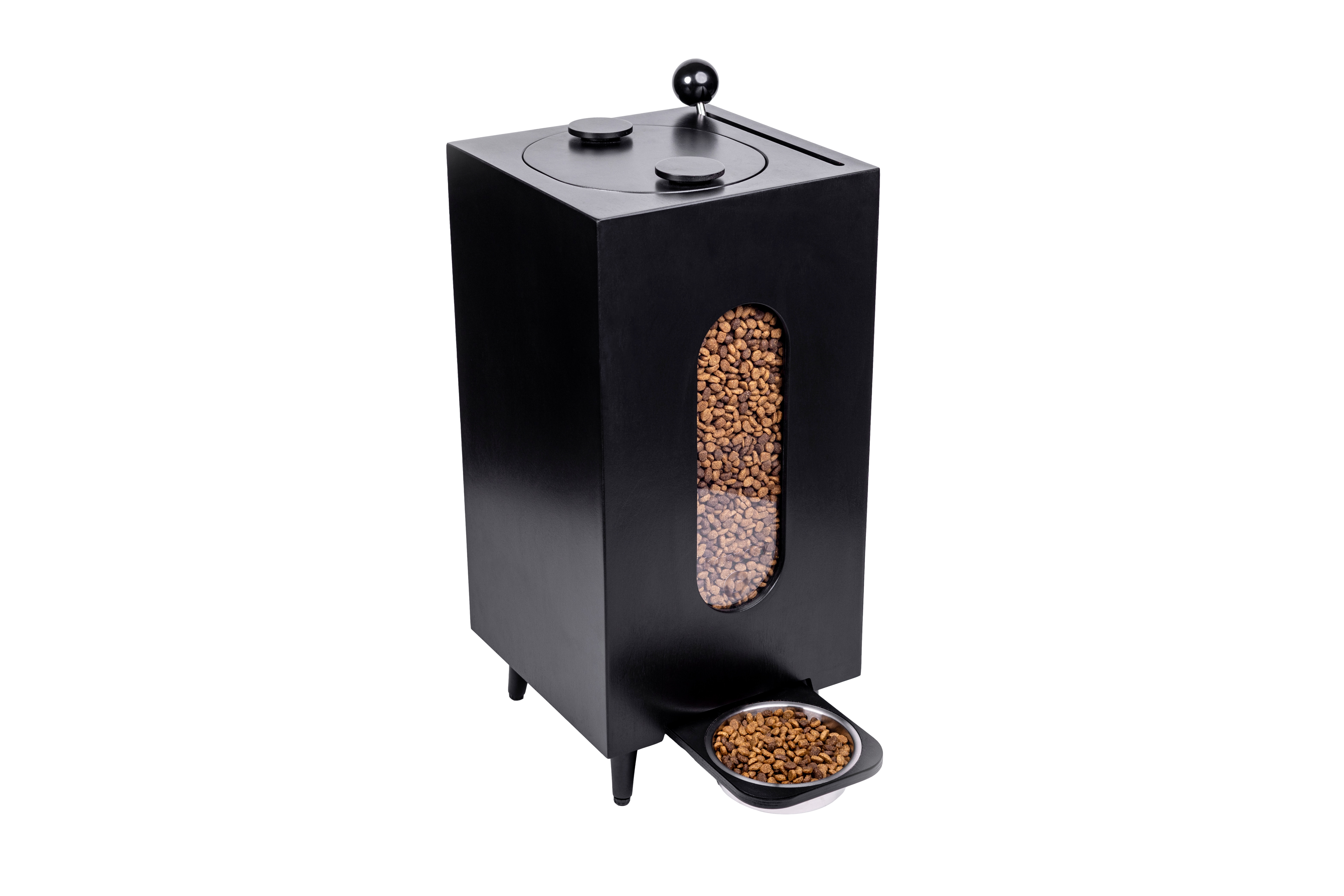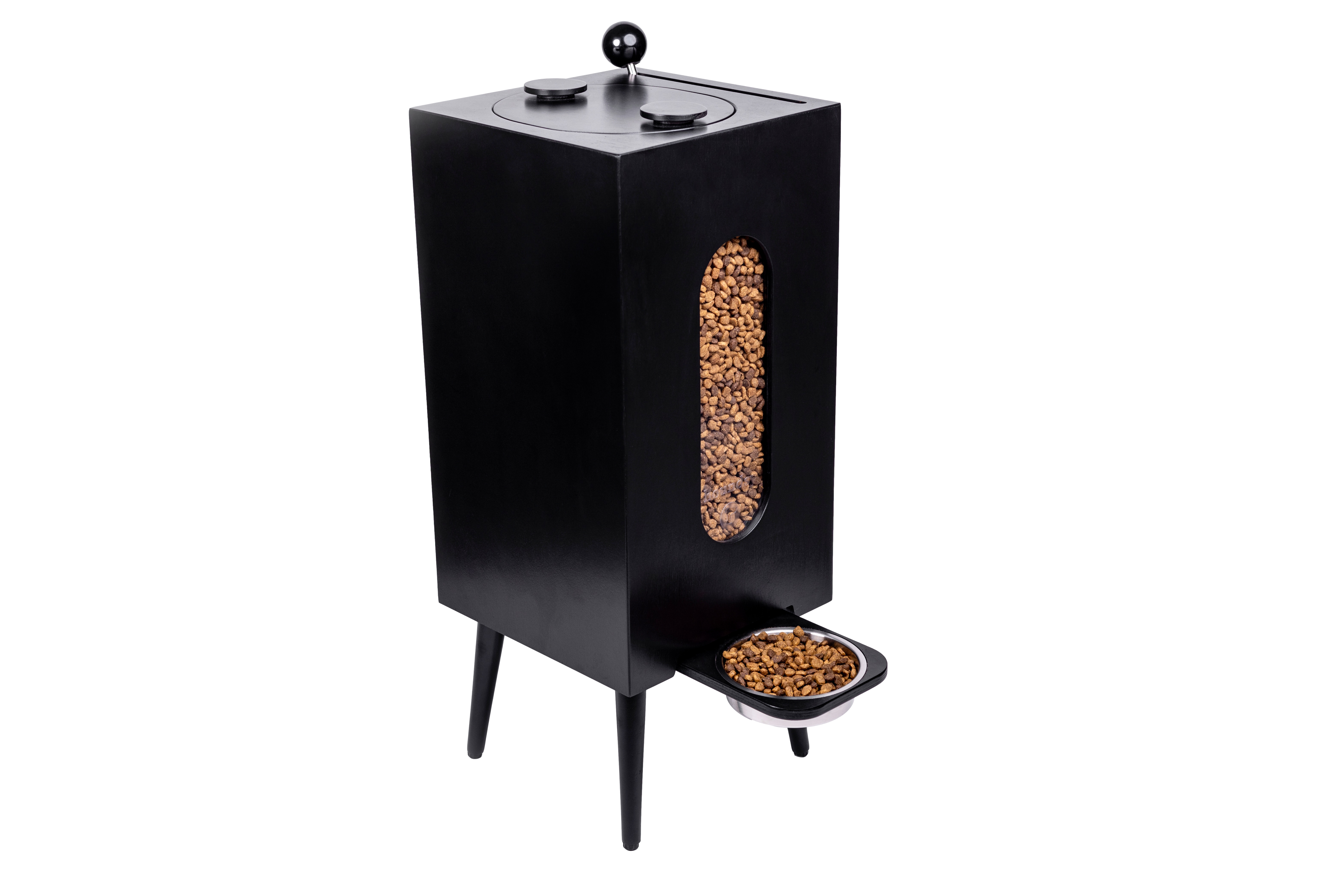 A mid-century modern dog kibble storage and dispenser system.