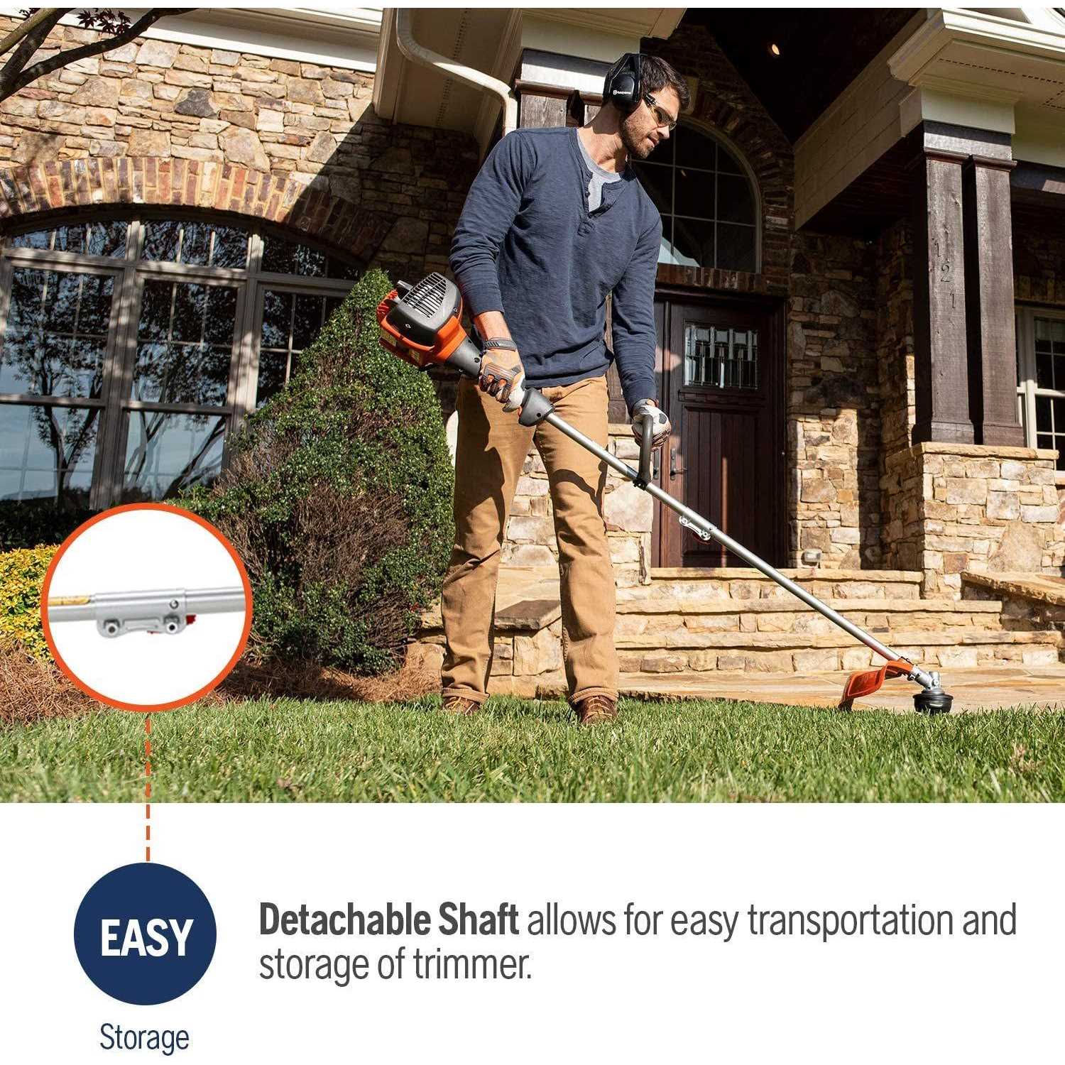 The Husqvarna Straight Shaft Trimmer is a multipurpose trimmer perfect for homeowners. It has a detachable shaft for flexibility. easy transport and storage. 28cc engine is easy to start with Smart Start recoil system and fuel pump. Strong braided-wire cable drive. Comes with an easy-loading T25 bump trimmer head. Shaft type: straight. HP: 1.1. Line diameter: 0.065″. 0.080″. 0.095″. Cutting width: 17″. Displacement: 28cc. Engine: gas. Fuel tank capacity (qt.): 0.42. Shaft length: 56.93″.